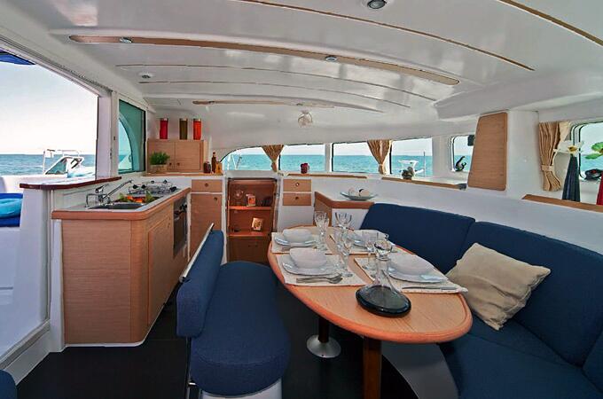 В центре салона установлен овальный стол, за которым свободно размещаются 8 человек. К салону примыкает хорошо оборудованный камбуз со всеми удобствами, характерными для домашней кухни – газовой плитой, раковиной, холодильником, горячей и холодной водой. Также на катамаране есть электроснабжение в 12V, автономное отопление и два туалета с душем. Хорошее настроение создаст современная аудиосистема.