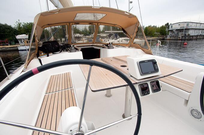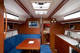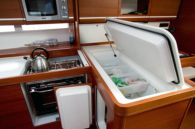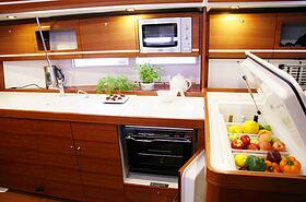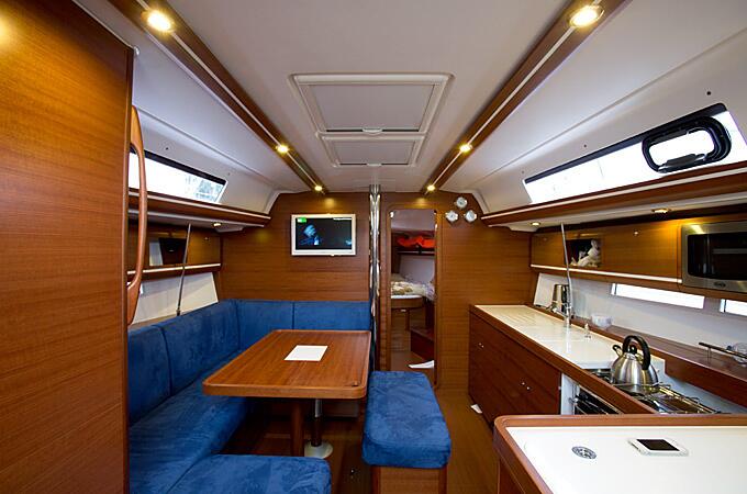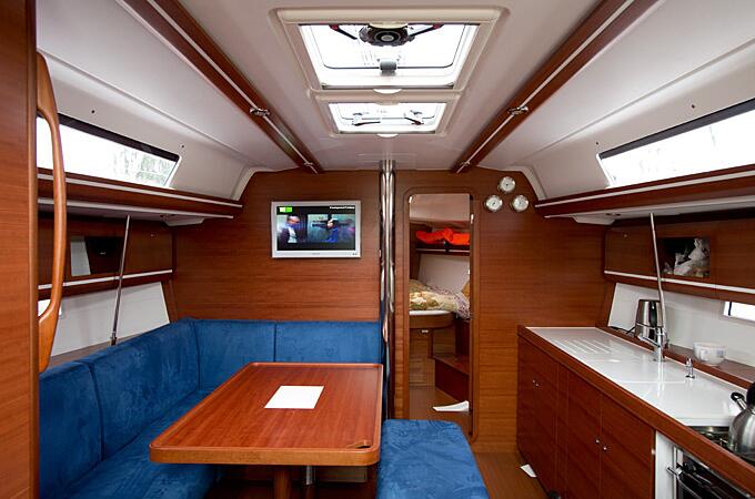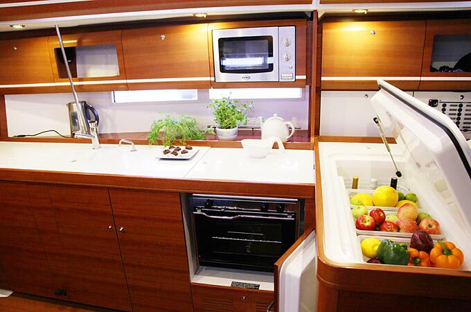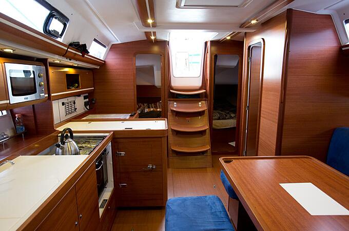 Кокпит яхты приятно удивляет своими размерами. На нем без труда могут разместиться 8 гостей и накрыть различными яствами установленный здесь же раздвижной стол. Все это на свежем воздухе – прямо под парусом и с великолепным обзором всего происходящего вокруг. В просторном салоне в дополнение к столу и шикарной отделке из красного дерева, установлен телевизор и DVD-проигрыватель. Рядом хорошо оборудованный камбуз (кухня) с горячей и холодной водой, газовой плитой, вместительным холодильником и морозилкой, а также микроволновой печью.